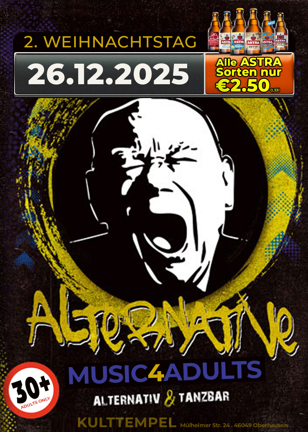 Wer über 30 Jahre alt ist, kann gerne mitfeiern und zu Hits von Nirvana, Tool, 3 Doors Down, Foo Fighters, The Chemical Brothers, Moby, Placebo und vielen anderen die Tanzfläche unsicher machen. Mit den Füßen im Takt mitwippen und ein Bier halten ist ebenso okay – Nichttänzer sind natürlich auch herzlich willkommen.
