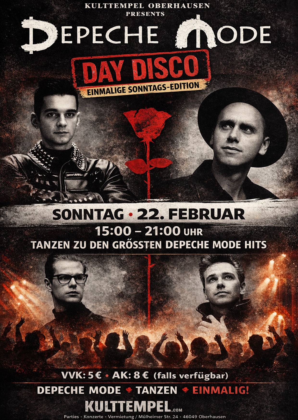 Im November 2025 haben wir euch gefragt, ob ihr euch vorstellen könnt, auch am Tag zu den größten Hits von Depeche Mode zu tanzen, anstatt in der Nacht. Die Resonanz von euch war riesengroß. Viele von euch haben uns geschrieben, auch sehr viele private Nachrichten erreichten uns. Die Meisten fanden es gut, dass wir die Party auf den Sonntagnachmittag verlegen, aber nur wenn es die Ausnahme bleiben wird. Und das versprechen wir!