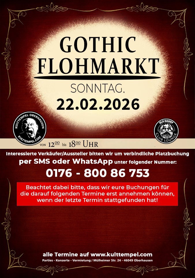 Am Sonntag, 22. Februar 2026 ab 12 Uhr => Gothic Flohmarkt im Kulttempel.