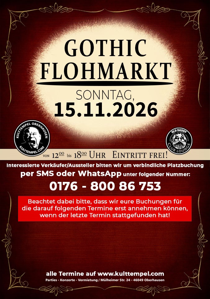 Am Sonntag, 15. November 2026 ab 12 Uhr => Gothic Flohmarkt im Kulttempel.